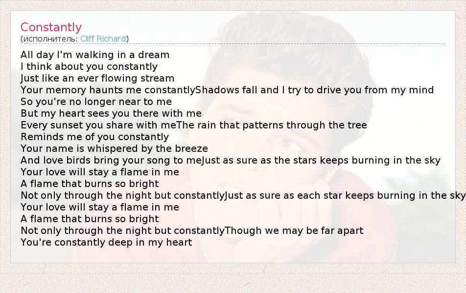All day I'm walking in a dream I think about you constantly Just like an ever flowing stream Your memory haunts me constantlyShadows fall and I try to drive you from my mind So you're no longer near to me But my heart sees you there with me Every sunset you share with meThe rain that patterns through the tree Reminds me of you constantly Your name is whispered by the breeze And love birds bring your song to meJust as sure as the stars keeps burning in the sky Your love will stay a flame in me A flame that burns so bright Not only through the night but constantlyJust as sure as each star keeps burning in the sky Your love will stay a flame in me A flame that burns so bright Not only through the night but constantlyThough we may be far apart You're constantly deep in my heart