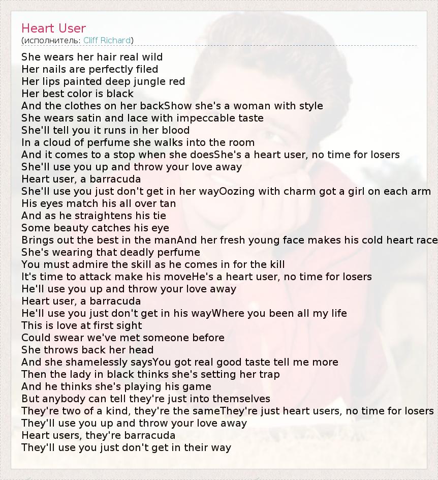 She wears her hair real wild Her nails are perfectly filed Her lips painted deep jungle red Her best color is black And the clothes on her backShow she's a woman with style She wears satin and lace with impeccable taste She'll tell you it runs in her blood In a cloud of perfume she walks into the room And it comes to a stop when she doesShe's a heart user, no time for losers She'll use you up and throw your love away Heart user, a barracuda She'll use you just don't get in her wayOozing with charm got a girl on each arm His eyes match his all over tan And as he straightens his tie Some beauty catches his eye Brings out the best in the manAnd her fresh young face makes his cold heart race She's wearing that deadly perfume You must admire the skill as he comes in for the kill It's time to attack make his moveHe's a heart user, no time for losers He'll use you up and throw your love away Heart user, a barracuda He'll use you just don't get in his wayWhere you been all my life This is love at first sight Could swear we've met someone before She throws back her head And she shamelessly saysYou got real good taste tell me more Then the lady in black thinks she's setting her trap And he thinks she's playing his game But anybody can tell they're just into themselves They're two of a kind, they're the sameThey're just heart users, no time for losers They'll use you up and throw your love away Heart users, they're barracuda They'll use you just don't get in their way