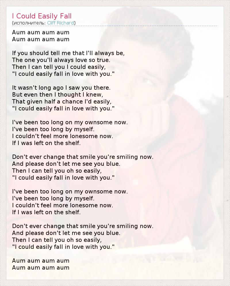 Aum aum aum aum Aum aum aum aum If you should tell me that I'll always be, The one you'll always love so true. Then I can tell you I could easily, "I could easily fall in love with you." It wasn't long ago I saw you there. But even then I thought I knew, That given half a chance I'd easily, "I could easily fall in love with you." I've been too long on my ownsome now. I've been too long by myself. I couldn't feel more lonesome now. If I was left on the shelf. Don't ever change that smile you're smiling now. And please don't let me see you blue. Then I can tell you oh so easily, "I could easily fall in love with you." I've been too long on my ownsome now. I've been too long by myself. I couldn't feel more lonesome now. If I was left on the shelf. Don't ever change that smile you're smiling now. And please don't let me see you blue. Then I can tell you oh so easily, "I could easily fall in love with you." Aum aum aum aum Aum aum aum aum