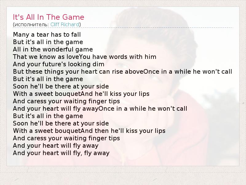 Many a tear has to fall But it's all in the game All in the wonderful game That we know as loveYou have words with him And your future's looking dim But these things your heart can rise aboveOnce in a while he won't call But it's all in the game Soon he'll be there at your side With a sweet bouquetAnd he'll kiss your lips And caress your waiting finger tips And your heart will fly awayOnce in a while he won't call But it's all in the game Soon he'll be there at your side With a sweet bouquetAnd then he'll kiss your lips And caress your waiting finger tips And your heart will fly away And your heart will fly, fly away