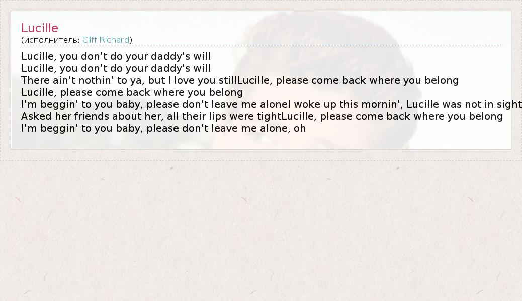 Lucille, you don't do your daddy's will Lucille, you don't do your daddy's will There ain't nothin' to ya, but I love you stillLucille, please come back where you belong Lucille, please come back where you belong I'm beggin' to you baby, please don't leave me aloneI woke up this mornin', Lucille was not in sight Asked her friends about her, all their lips were tightLucille, please come back where you belong I'm beggin' to you baby, please don't leave me alone, oh