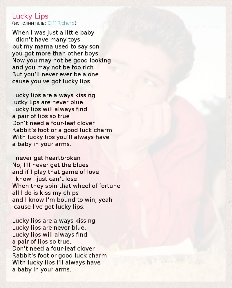 When I was just a little baby I didn't have many toys but my mama used to say son you got more than other boys Now you may not be good looking and you may not be too rich But you'll never ever be alone cause you've got lucky lips Lucky lips are always kissing lucky lips are never blue Lucky lips will always find a pair of lips so true Don't need a four-leaf clover Rabbit's foot or a good luck charm With lucky lips you'll always have a baby in your arms. I never get heartbroken No, I'll never get the blues and if I play that game of love I know I just can't lose When they spin that wheel of fortune all I do is kiss my chips and I know I'm bound to win, yeah 'cause I've got lucky lips. Lucky lips are always kissing Lucky lips are never blue. Lucky lips will always find a pair of lips so true. Don't need a four-leaf clover Rabbit's foot or good luck charm With lucky lips I'll always have a baby in your arms.