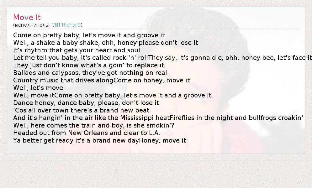 Come on pretty baby, let's move it and groove it Well, a shake a baby shake, ohh, honey please don't lose it It's rhythm that gets your heart and soul Let me tell you baby, it's called rock 'n' rollThey say, it's gonna die, ohh, honey bee, let's face it They just don't know what's a goin' to replace it Ballads and calypsos, they've got nothing on real Country music that drives alongCome on honey, move it Well, let's move Well, move itCome on pretty baby, let's move it and a groove it Dance honey, dance baby, please, don't lose it 'Cos all over town there's a brand new beat And it's hangin' in the air like the Mississippi heatFireflies in the night and bullfrogs croakin' Well, here comes the train and boy, is she smokin'? Headed out from New Orleans and clear to L.A. Ya better get ready it's a brand new dayHoney, move it