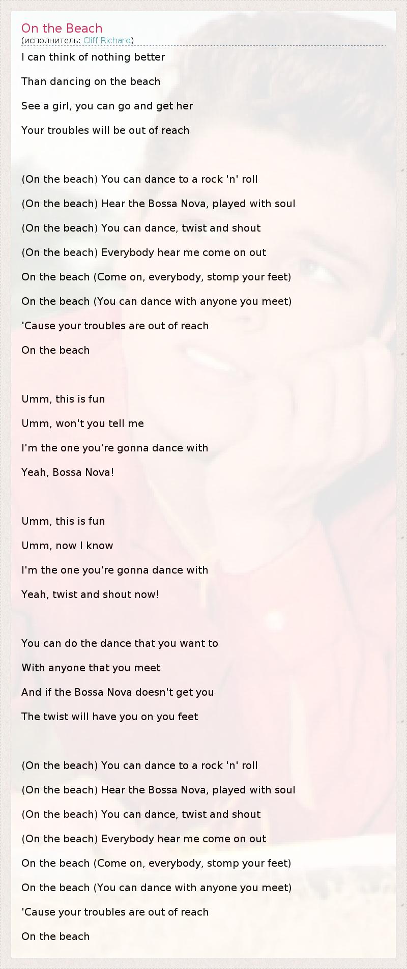 I can think of nothing better Than dancing on the beach See a girl, you can go and get her Your troubles will be out of reach (On the beach) You can dance to a rock 'n' roll (On the beach) Hear the Bossa Nova, played with soul (On the beach) You can dance, twist and shout (On the beach) Everybody hear me come on out On the beach (Come on, everybody, stomp your feet) On the beach (You can dance with anyone you meet) 'Cause your troubles are out of reach On the beach Umm, this is fun Umm, won't you tell me I'm the one you're gonna dance with Yeah, Bossa Nova! Umm, this is fun Umm, now I know I'm the one you're gonna dance with Yeah, twist and shout now! You can do the dance that you want to With anyone that you meet And if the Bossa Nova doesn't get you The twist will have you on you feet (On the beach) You can dance to a rock 'n' roll (On the beach) Hear the Bossa Nova, played with soul (On the beach) You can dance, twist and shout (On the beach) Everybody hear me come on out On the beach (Come on, everybody, stomp your feet) On the beach (You can dance with anyone you meet) 'Cause your troubles are out of reach On the beach