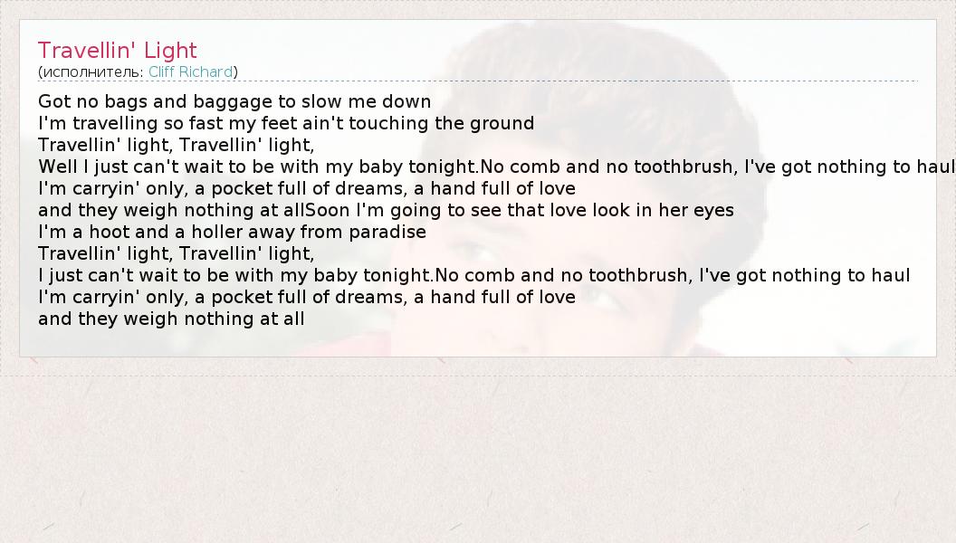 А как ты думаешь, о чем песня "Travellin' Light" ?