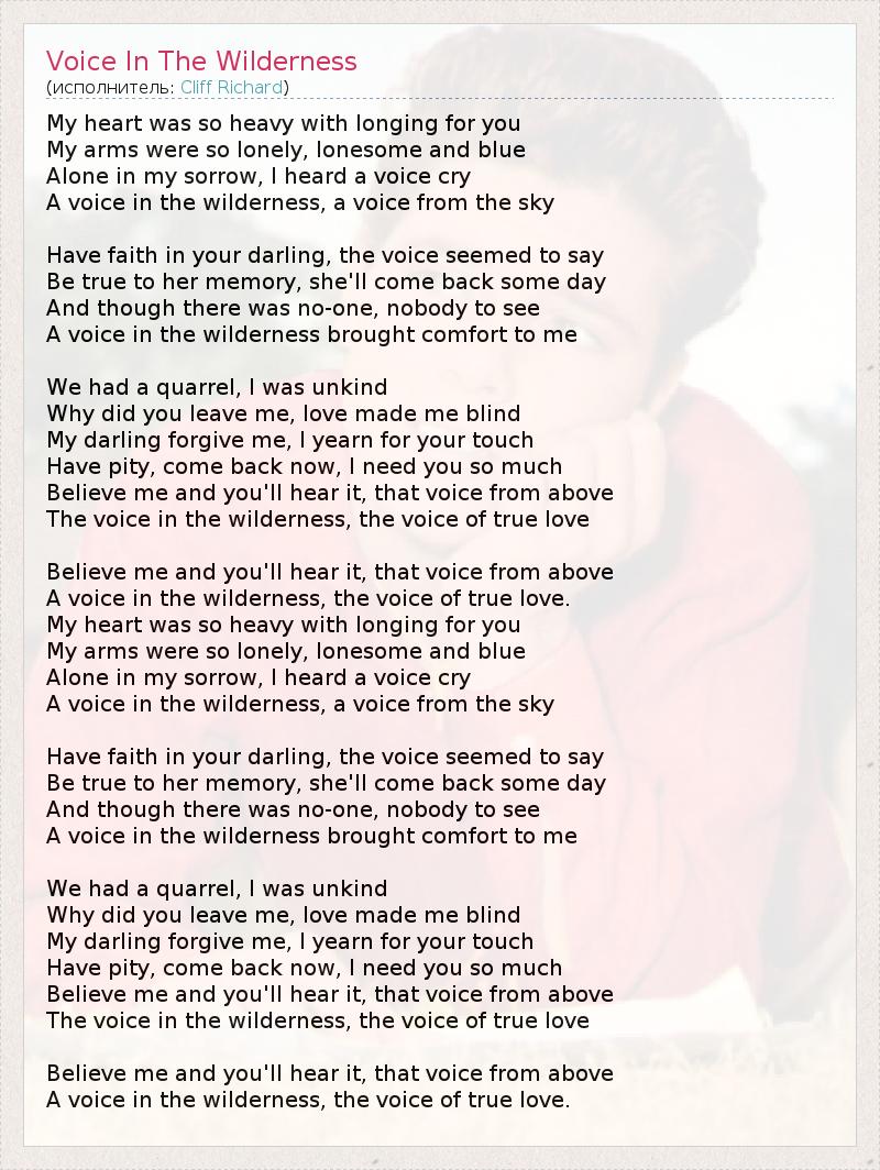 My heart was so heavy with longing for you My arms were so lonely, lonesome and blue Alone in my sorrow, I heard a voice cry A voice in the wilderness, a voice from the sky Have faith in your darling, the voice seemed to say Be true to her memory, she'll come back some day And though there was no-one, nobody to see A voice in the wilderness brought comfort to me We had a quarrel, I was unkind Why did you leave me, love made me blind My darling forgive me, I yearn for your touch Have pity, come back now, I need you so much Believe me and you'll hear it, that voice from above The voice in the wilderness, the voice of true love Believe me and you'll hear it, that voice from above A voice in the wilderness, the voice of true love. My heart was so heavy with longing for you My arms were so lonely, lonesome and blue Alone in my sorrow, I heard a voice cry A voice in the wilderness, a voice from the sky Have faith in your darling, the voice seemed to say Be true to her memory, she'll come back some day And though there was no-one, nobody to see A voice in the wilderness brought comfort to me We had a quarrel, I was unkind Why did you leave me, love made me blind My darling forgive me, I yearn for your touch Have pity, come back now, I need you so much Believe me and you'll hear it, that voice from above The voice in the wilderness, the voice of true love Believe me and you'll hear it, that voice from above A voice in the wilderness, the voice of true love.
