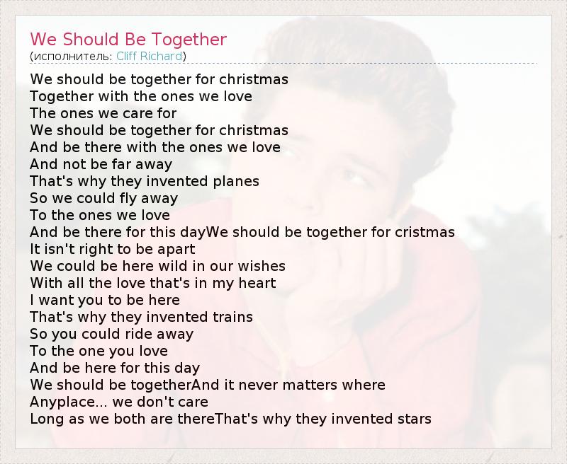 We should be together for christmas Together with the ones we love The ones we care for We should be together for christmas And be there with the ones we love And not be far away That's why they invented planes So we could fly away To the ones we love And be there for this dayWe should be together for cristmas It isn't right to be apart We could be here wild in our wishes With all the love that's in my heart I want you to be here That's why they invented trains So you could ride away To the one you love And be here for this day We should be togetherAnd it never matters where Anyplace... we don't care Long as we both are thereThat's why they invented stars