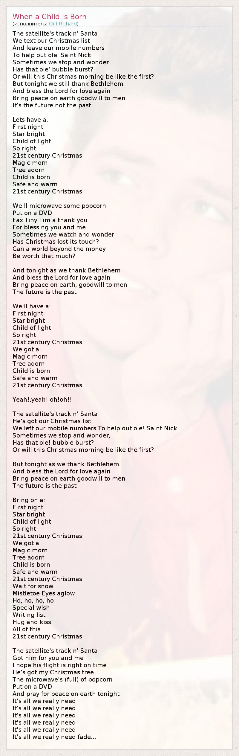 The satellite's trackin' Santa We text our Christmas list And leave our mobile numbers To help out ole' Saint Nick. Sometimes we stop and wonder Has that ole' bubble burst? Or will this Christmas morning be like the first? But tonight we still thank Bethlehem And bless the Lord for love again Bring peace on earth goodwill to men It's the future not the past Lets have a: First night Star bright Child of light So right 21st century Christmas Magic morn Tree adorn Child is born Safe and warm 21st century Christmas We'll microwave some popcorn Put on a DVD Fax Tiny Tim a thank you For blessing you and me Sometimes we watch and wonder Has Christmas lost its touch? Can a world beyond the money Be worth that much? And tonight as we thank Bethlehem And bless the Lord for love again Bring peace on earth, goodwill to men The future is the past We'll have a: First night Star bright Child of light So right 21st century Christmas We got a: Magic morn Tree adorn Child is born Safe and warm 21st century Christmas Yeah!.yeah!.oh!oh!! The satellite's trackin' Santa He's got our Christmas list We left our mobile numbers To help out ole! Saint Nick Sometimes we stop and wonder, Has that ole! bubble burst? Or will this Christmas morning be like the first? But tonight as we thank Bethlehem And bless the Lord for love again Bring peace on earth goodwill to men The future is the past Bring on a: First night Star bright Child of light So right 21st century Christmas We got a: Magic morn Tree adorn Child is born Safe and warm 21st century Christmas Wait for snow Mistletoe Eyes aglow Ho, ho, ho, ho! Special wish Writing list Hug and kiss All of this 21st century Christmas The satellite's trackin' Santa Got him for you and me I hope his flight is right on time He's got my Christmas tree The microwave's (full) of popcorn Put on a DVD And pray for peace on earth tonight It's all we really need It's all we really need It's all we really need It's all we really need It's all we really need It's all we really need fade...