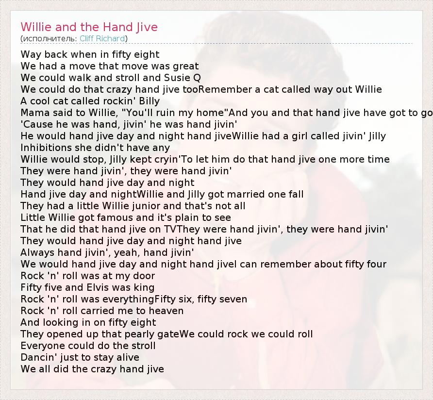 Way back when in fifty eight We had a move that move was great We could walk and stroll and Susie Q We could do that crazy hand jive tooRemember a cat called way out Willie A cool cat called rockin' Billy Mama said to Willie, "You'll ruin my home"And you and that hand jive have got to go 'Cause he was hand, jivin' he was hand jivin' He would hand jive day and night hand jiveWillie had a girl called jivin' Jilly Inhibitions she didn't have any Willie would stop, Jilly kept cryin'To let him do that hand jive one more time They were hand jivin', they were hand jivin' They would hand jive day and night Hand jive day and nightWillie and Jilly got married one fall They had a little Willie junior and that's not all Little Willie got famous and it's plain to see That he did that hand jive on TVThey were hand jivin', they were hand jivin' They would hand jive day and night hand jive Always hand jivin', yeah, hand jivin' We would hand jive day and night hand jiveI can remember about fifty four Rock 'n' roll was at my door Fifty five and Elvis was king Rock 'n' roll was everythingFifty six, fifty seven Rock 'n' roll carried me to heaven And looking in on fifty eight They opened up that pearly gateWe could rock we could roll Everyone could do the stroll Dancin' just to stay alive We all did the crazy hand jive