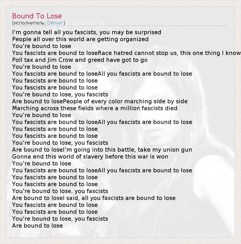I'm gonna tell all you fascists, you may be surprised People all over this world are getting organized You're bound to lose You fascists are bound to loseRace hatred cannot stop us, this one thing I know Poll tax and Jim Crow and greed have got to go You're bound to lose You fascists are bound to loseAll you fascists are bound to lose You fascists are bound to lose You fascists are bound to lose You're bound to lose, you fascists Are bound to losePeople of every color marching side by side Marching across these fields where a million fascists died You're bound to lose You fascists are bound to loseAll you fascists are bound to lose You fascists are bound to lose You fascists are bound to lose You're bound to lose, you fascists Are bound to loseI'm going into this battle, take my union gun Gonna end this world of slavery before this war is won You're bound to lose You fascists are bound to loseAll you fascists are bound to lose You fascists are bound to lose You fascists are bound to lose You're bound to lose, you fascists Are bound to loseI said, all you fascists are bound to lose You fascists are bound to lose You fascists are bound to lose You're bound to lose, you fascists Are bound to lose