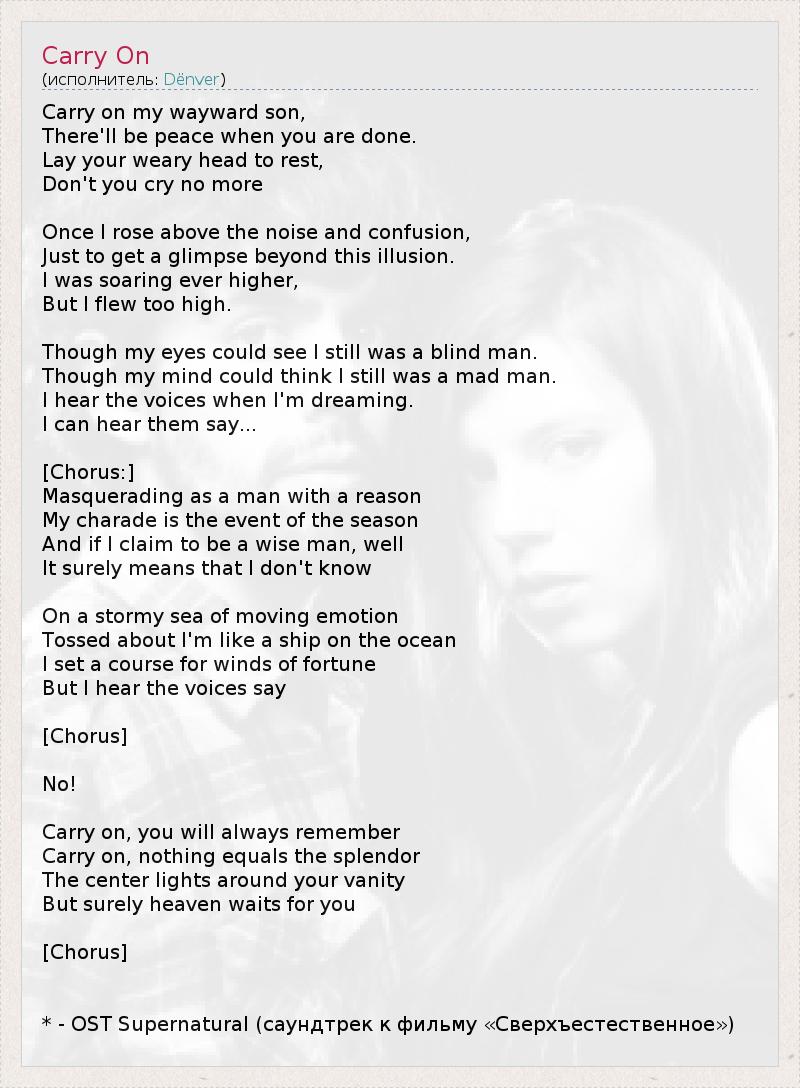 Carry on my wayward son, There'll be peace when you are done. Lay your weary head to rest, Don't you cry no more Once I rose above the noise and confusion, Just to get a glimpse beyond this illusion. I was soaring ever higher, But I flew too high. Though my eyes could see I still was a blind man. Though my mind could think I still was a mad man. I hear the voices when I'm dreaming. I can hear them say... [Chorus:] Masquerading as a man with a reason My charade is the event of the season And if I claim to be a wise man, well It surely means that I don't know On a stormy sea of moving emotion Tossed about I'm like a ship on the ocean I set a course for winds of fortune But I hear the voices say [Chorus] No! Carry on, you will always remember Carry on, nothing equals the splendor The center lights around your vanity But surely heaven waits for you [Chorus] * - OST Supernatural (саундтрек к фильму «Сверхъестественное»)