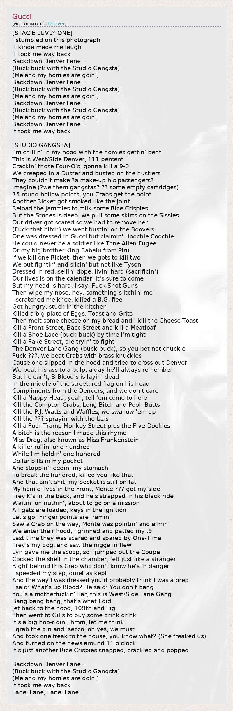 [STACIE LUVLY ONE] I stumbled on this photograph It kinda made me laugh It took me way back Backdown Denver Lane... (Buck buck with the Studio Gangsta) (Me and my homies are goin') Backdown Denver Lane... (Buck buck with the Studio Gangsta) (Me and my homies are goin') Backdown Denver Lane... (Buck buck with the Studio Gangsta) (Me and my homies are goin') Backdown Denver Lane... It took me way back [STUDIO GANGSTA] I'm chillin' in my hood with the homies gettin' bent This is West/Side Denver, 111 percent Crackin' those Four-O's, gonna kill a 9-0 We creeped in a Duster and busted on the hustlers They couldn't make ?a make-up his passengers? Imagine (?we them gangstas? ?? some empty cartridges) 75 round hollow points, you Crabs get the point Another Ricket got smoked like the joint Reload the jammies to milk some Rice Crispies But the Stones is deep, we pull some skirts on the Sissies Our driver got scared so we had to remove her (Fuck that bitch) we went bustin' on the Boovers One was dressed in Gucci but claimin' Hoochie Coochie He could never be a soldier like Tone Allen Fugee Or my big brother King Babalu from Piru If we kill one Ricket, then we gots to kill two We out fightin' and slicin' but not like Tyson Dressed in red, sellin' dope, livin' hard (sacrificin') Our lives is on the calendar, it's sure to come But my head is hard, I say: Fuck Snot Guns! Then wipe my nose, hey, something's itchin' me I scratched me knee, killed a B.G. flee Got hungry, stuck in the kitchen Killed a big plate of Eggs, Toast and Grits Then melt some cheese on my bread and I kill the Cheese Toast Kill a Front Street, Bacc Street and kill a Meatloaf Kill a Shoe-Lace (buck-buck) by time I'm tight Kill a Fake Street, die tryin' to fight The Denver Lane Gang (buck-buck), so you bet not chuckle Fuck ???, we beat Crabs with brass knuckles Cause one slipped in the hood and tried to cross out Denver We beat his ass to a pulp, a day he'll always remember But he can't, B-Blood's is layin' dead In the middle of the street, red flag on his head Compliments from the Denvers, and we don't care Kill a Nappy Head, yeah, tell 'em come to here Kill the Compton Crabs, Long Bitch and Pooh Butts Kill the P.J. Watts and Waffles, we swallow 'em up Kill the ??? sprayin' with the Uzis Kill a Four Tramp Monkey Street plus the Five-Dookies A bitch is the reason I made this rhyme Miss Drag, also known as Miss Frankenstein A killer rollin' one hundred While I'm holdin' one hundred Dollar bills in my pocket And stoppin' feedin' my stomach To break the hundred, killed you like that And that ain't shit, my pocket is still on fat My homie lives in the Front, Monte ??? got my side Trey K's in the back, and he's strapped in his black ride Waitin' on nuthin', about to go on a mission All gats are loaded, keys in the ignition Let's go! Finger points are framin' Saw a Crab on the way, Monte was pointin' and aimin' We enter their hood, I grinned and patted my .9 Last time they was scared and spared by One-Time Trey's my dog, and saw the nigga in flew Lyn gave me the scoop, so I jumped out the Coupe Cocked the shell in the chamber, felt just like a stranger Right behind this Crab who don't know he's in danger I speeded my step, quiet as kept And the way I was dressed you'd probably think I was a prep I said: What's up Blood? He said: You don't bang You's a motherfuckin' liar, this is West/Side Lane Gang Bang bang bang, that's what I did Jet back to the hood, 109th and Fig' Then went to Gills to buy some drink drink It's a big hoo-ridin', hmm, let me think I grab the gin and 'secco, oh yes, we must And took one freak to the house, you know what? (She freaked us) And turned on the news around 11 o'clock It's just another Rice Crispies snapped, crackled and popped Backdown Denver Lane... (Buck buck with the Studio Gangsta) (Me and my homies are doin') It took me way back Lane, Lane, Lane, Lane...