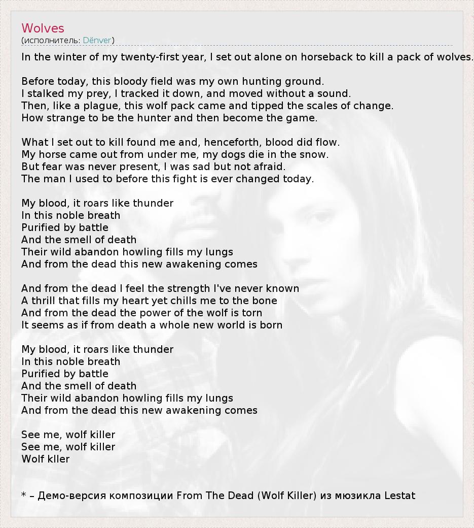 In the winter of my twenty-first year, I set out alone on horseback to kill a pack of wolves. Before today, this bloody field was my own hunting ground. I stalked my prey, I tracked it down, and moved without a sound. Then, like a plague, this wolf pack came and tipped the scales of change. How strange to be the hunter and then become the game. What I set out to kill found me and, henceforth, blood did flow. My horse came out from under me, my dogs die in the snow. But fear was never present, I was sad but not afraid. The man I used to before this fight is ever changed today. My blood, it roars like thunder In this noble breath Purified by battle And the smell of death Their wild abandon howling fills my lungs And from the dead this new awakening comes And from the dead I feel the strength I've never known A thrill that fills my heart yet chills me to the bone And from the dead the power of the wolf is torn It seems as if from death a whole new world is born My blood, it roars like thunder In this noble breath Purified by battle And the smell of death Their wild abandon howling fills my lungs And from the dead this new awakening comes See me, wolf killer See me, wolf killer Wolf kller * – Демо-версия композиции From The Dead (Wolf Killer) из мюзикла Lestat