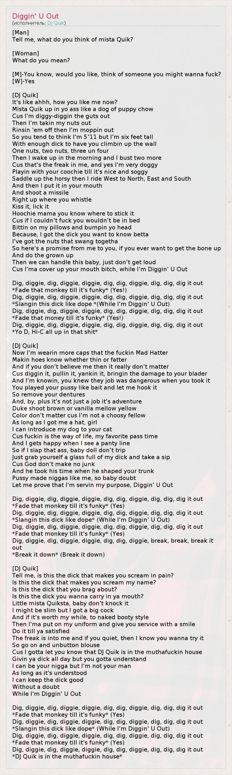 [Man] Tell me, what do you think of mista Quik? [Woman] What do you mean? [M]-You know, would you like, think of someone you might wanna fuck? [W]-Yes [DJ Quik] It's like ahhh, how you like me now? Mista Quik up in yo ass like a dog of puppy chow Cus I'm diggy-diggin the guts out Then I'm takin my nuts out Rinsin ‘em off then I'm moppin out So you tend to think I'm 5'11 but I'm six feet tall With enough dick to have you climbin up the wall One nuts, two nuts, three un four Then I wake up in the morning and I bust two more Cus that's the freak in me, and yes I'm very doggy Playin with your coochie till it's nice and soggy Saddle up the horsy then I ride West to North, East and South And then I put it in your mouth And shoot a missile Right up where you whistle Kiss it, lick it Hoochie mama you know where to stick it Cus if I couldn't fuck you wouldn't be in bed Bittin on my pillows and bumpin yo head Because, I got the dick you want to know betta I've got the nuts that swang togetha So here's a promise from me to you, if you ever want to get the bone up And do the grown up Then we can handle this baby, just don't get loud Cus I'ma cover up your mouth bitch, while I'm Diggin' U Out Dig, diggie, dig, diggie, diggie, dig, dig, diggie, dig, dig, dig it out *Fade that monkey till it's funky* (Yes!) Dig, diggie, dig, diggie, diggie, dig, dig, diggie, dig, dig, dig it out *Slangin this dick like dope *(While I'm Diggin' U Out) Dig, diggie, dig, diggie, diggie, dig, dig, diggie, dig, dig, dig it out *Fade that money till it's funky* (Yes!) Dig, diggie, dig, diggie, diggie, dig, dig, diggie, dig, dig, dig it out *Yo D, Hi-C all up in that shit* [DJ Quik] Now I'm wearin more caps that the fuckin Mad Hatter Makin hoes know whether thin or fatter And if you don't believe me then it really don't matter Cus diggin it, pullin it, yankin it, bringin the damage to your blader And I'm knowin, you knew they job was dangerous when you took it You played your pussy like bait and let me hook it So remove your dentures And, by, plus it's not just a job it's adventure Duke shoot brown or vanilla mellow yellow Color don't matter cus I'm not a choosy fellow As long as I got me a hat, girl I can introduce my dog to your cat Cus fuckin is the way of life, my favorite pass time And I gets happy when I see a panty line So if I slap that ass, baby doll don't trip Just grab yourself a glass full of my dick and take a sip Cus God don't make no junk And he took his time when he shaped your trunk Pussy made niggas like me, so baby doubt Let me prove that I'm servin my purpose, Diggin' U Out Dig, diggie, dig, diggie, diggie, dig, dig, diggie, dig, dig, dig it out *Fade that monkey till it's funky* (Yes) Dig, diggie, dig, diggie, diggie, dig, dig, diggie, dig, dig, dig it out *Slangin this dick like dope* (While I'm Diggin' U Out) Dig, diggie, dig, diggie, diggie, dig, dig, diggie, dig, dig, dig it out *Fade that monkey till it's funky* (Yes) Dig, diggie, dig, diggie, diggie, dig, dig, diggie, break, break, break it out *Break it down* (Break it down) [DJ Quik] Tell me, is this the dick that makes you scream in pain? Is this the dick that makes you scream my name? Is this the dick that you brag about? Is this the dick you wanna carry in ya mouth? Little mista Quiksta, baby don't knock it I might be slim but I got a big cock And if it's worth my while, to naked booty style Then I'ma put on my uniform and give you service with a smile Do it till ya satisfied The freak is into me and if you quiet, then I know you wanna try it So go on and unbutton blouse Cus I gotta let you know that DJ Quik is in the muthafuckin house Givin ya dick all day but you gotta understand I can be your nigga but I'm not your man As long as it's understood I can keep the dick good Without a doubt While I'm Diggin' U Out Dig, diggie, dig, diggie, diggie, dig, dig, diggie, dig, dig, dig it out *Fade that monkey till it's funky* (Yes) Dig, diggie, dig, diggie, diggie, dig, dig, diggie, dig, dig, dig it out *Slangin this dick like dope* (While I'm Diggin' U Out) Dig, diggie, dig, diggie, diggie, dig, dig, diggie, dig, dig, dig it out *Fade that monkey till it's funky* (Yes) Dig, diggie, dig, diggie, diggie, dig, dig, diggie, dig, dig, dig it out *DJ Quik is in the muthafuckin house*