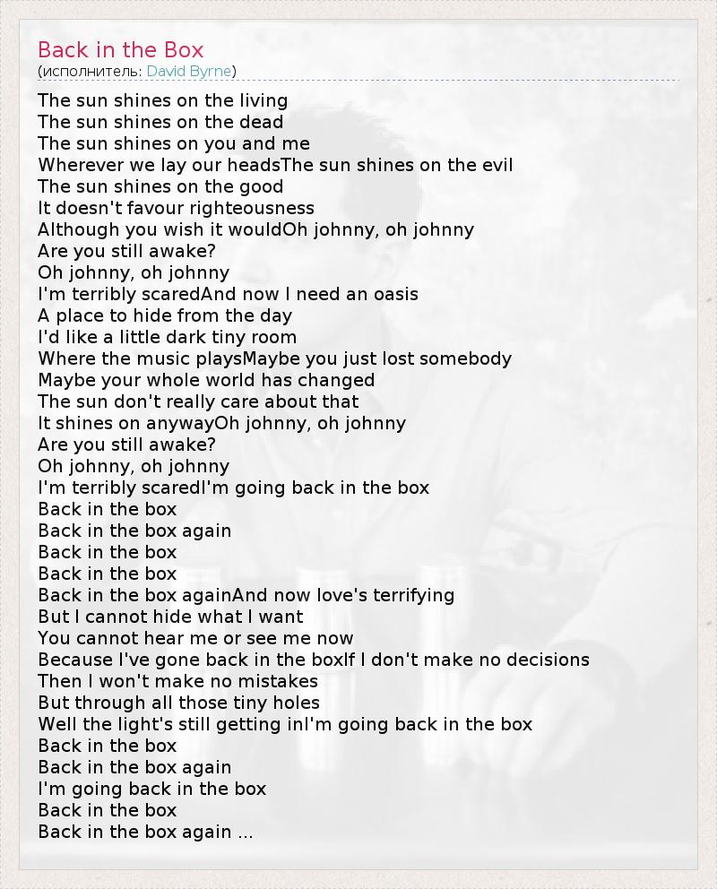 The sun shines on the living The sun shines on the dead The sun shines on you and me Wherever we lay our headsThe sun shines on the evil The sun shines on the good It doesn't favour righteousness Although you wish it wouldOh johnny, oh johnny Are you still awake? Oh johnny, oh johnny I'm terribly scaredAnd now I need an oasis A place to hide from the day I'd like a little dark tiny room Where the music playsMaybe you just lost somebody Maybe your whole world has changed The sun don't really care about that It shines on anywayOh johnny, oh johnny Are you still awake? Oh johnny, oh johnny I'm terribly scaredI'm going back in the box Back in the box Back in the box again Back in the box Back in the box Back in the box againAnd now love's terrifying But I cannot hide what I want You cannot hear me or see me now Because I've gone back in the boxIf I don't make no decisions Then I won't make no mistakes But through all those tiny holes Well the light's still getting inI'm going back in the box Back in the box Back in the box again I'm going back in the box Back in the box Back in the box again ...