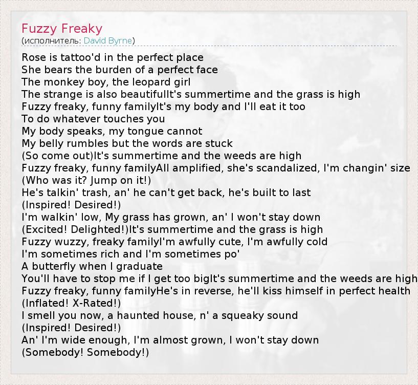 Rose is tattoo'd in the perfect place She bears the burden of a perfect face The monkey boy, the leopard girl The strange is also beautifulIt's summertime and the grass is high Fuzzy freaky, funny familyIt's my body and I'll eat it too To do whatever touches you My body speaks, my tongue cannot My belly rumbles but the words are stuck (So come out)It's summertime and the weeds are high Fuzzy freaky, funny familyAll amplified, she's scandalized, I'm changin' size (Who was it? Jump on it!) He's talkin' trash, an' he can't get back, he's built to last (Inspired! Desired!) I'm walkin' low, My grass has grown, an' I won't stay down (Excited! Delighted!)It's summertime and the grass is high Fuzzy wuzzy, freaky familyI'm awfully cute, I'm awfully cold I'm sometimes rich and I'm sometimes po' A butterfly when I graduate You'll have to stop me if I get too bigIt's summertime and the weeds are high Fuzzy freaky, funny familyHe's in reverse, he'll kiss himself in perfect health (Inflated! X-Rated!) I smell you now, a haunted house, n' a squeaky sound (Inspired! Desired!) An' I'm wide enough, I'm almost grown, I won't stay down (Somebody! Somebody!)