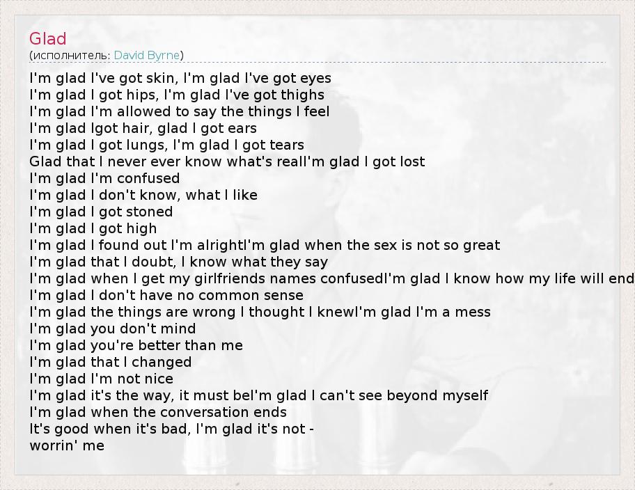 I'm glad I've got skin, I'm glad I've got eyes I'm glad I got hips, I'm glad I've got thighs I'm glad I'm allowed to say the things I feel I'm glad Igot hair, glad I got ears I'm glad I got lungs, I'm glad I got tears Glad that I never ever know what's realI'm glad I got lost I'm glad I'm confused I'm glad I don't know, what I like I'm glad I got stoned I'm glad I got high I'm glad I found out I'm alrightI'm glad when the sex is not so great I'm glad that I doubt, I know what they say I'm glad when I get my girlfriends names confusedI'm glad I know how my life will end I'm glad I don't have no common sense I'm glad the things are wrong I thought I knewI'm glad I'm a mess I'm glad you don't mind I'm glad you're better than me I'm glad that I changed I'm glad I'm not nice I'm glad it's the way, it must beI'm glad I can't see beyond myself I'm glad when the conversation ends It's good when it's bad, I'm glad it's not - worrin' me
