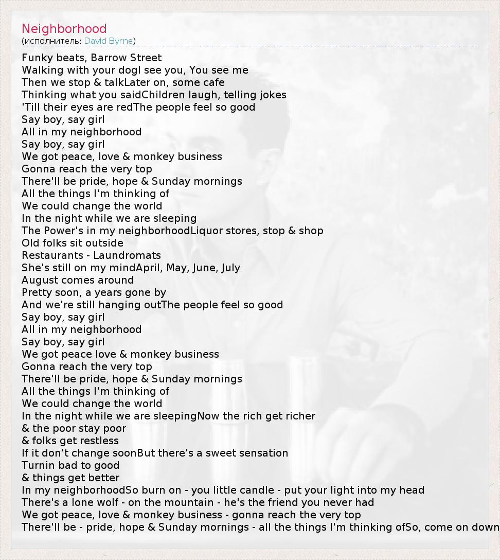 Funky beats, Barrow Street Walking with your dogI see you, You see me Then we stop & talkLater on, some cafe Thinking what you saidChildren laugh, telling jokes 'Till their eyes are redThe people feel so good Say boy, say girl All in my neighborhood Say boy, say girl We got peace, love & monkey business Gonna reach the very top There'll be pride, hope & Sunday mornings All the things I'm thinking of We could change the world In the night while we are sleeping The Power's in my neighborhoodLiquor stores, stop & shop Old folks sit outside Restaurants - Laundromats She's still on my mindApril, May, June, July August comes around Pretty soon, a years gone by And we're still hanging outThe people feel so good Say boy, say girl All in my neighborhood Say boy, say girl We got peace love & monkey business Gonna reach the very top There'll be pride, hope & Sunday mornings All the things I'm thinking of We could change the world In the night while we are sleepingNow the rich get richer & the poor stay poor & folks get restless If it don't change soonBut there's a sweet sensation Turnin bad to good & things get better In my neighborhoodSo burn on - you little candle - put your light into my head There's a lone wolf - on the mountain - he's the friend you never had We got peace, love & monkey business - gonna reach the very top There'll be - pride, hope & Sunday mornings - all the things I'm thinking ofSo, come on down