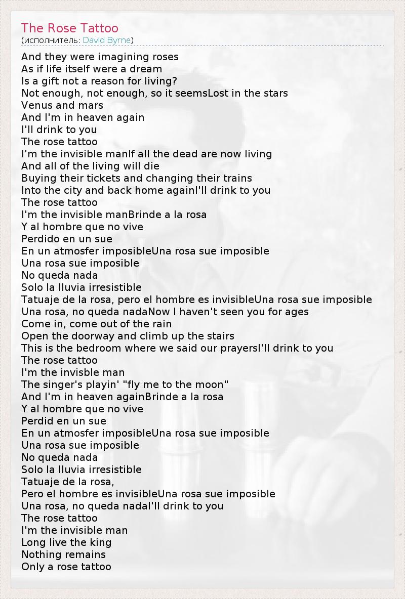 And they were imagining roses As if life itself were a dream Is a gift not a reason for living? Not enough, not enough, so it seemsLost in the stars Venus and mars And I'm in heaven again I'll drink to you The rose tattoo I'm the invisible manIf all the dead are now living And all of the living will die Buying their tickets and changing their trains Into the city and back home againI'll drink to you The rose tattoo I'm the invisible manBrinde a la rosa Y al hombre que no vive Perdido en un sue En un atmosfer imposibleUna rosa sue imposible Una rosa sue imposible No queda nada Solo la lluvia irresistible Tatuaje de la rosa, pero el hombre es invisibleUna rosa sue imposible Una rosa, no queda nadaNow I haven't seen you for ages Come in, come out of the rain Open the doorway and climb up the stairs This is the bedroom where we said our prayersI'll drink to you The rose tattoo I'm the invisble man The singer's playin' "fly me to the moon" And I'm in heaven againBrinde a la rosa Y al hombre que no vive Perdid en un sue En un atmosfer imposibleUna rosa sue imposible Una rosa sue imposible No queda nada Solo la lluvia irresistible Tatuaje de la rosa, Pero el hombre es invisibleUna rosa sue imposible Una rosa, no queda nadaI'll drink to you The rose tattoo I'm the invisible man Long live the king Nothing remains Only a rose tattoo
