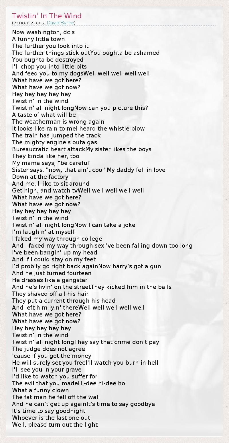 А как ты думаешь, о чем песня "Twistin' In The Wind" ?