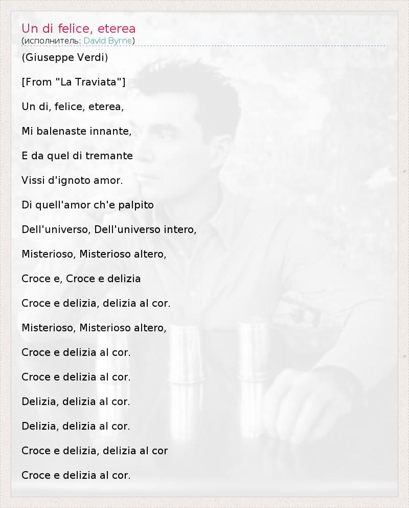 (Giuseppe Verdi) [From "La Traviata"] Un di, felice, eterea, Mi balenaste innante, E da quel di tremante Vissi d'ignoto amor. Di quell'amor ch'e palpito Dell'universo, Dell'universo intero, Misterioso, Misterioso altero, Croce e, Croce e delizia Croce e delizia, delizia al cor. Misterioso, Misterioso altero, Croce e delizia al cor. Croce e delizia al cor. Delizia, delizia al cor. Delizia, delizia al cor. Croce e delizia, delizia al cor Croce e delizia al cor.