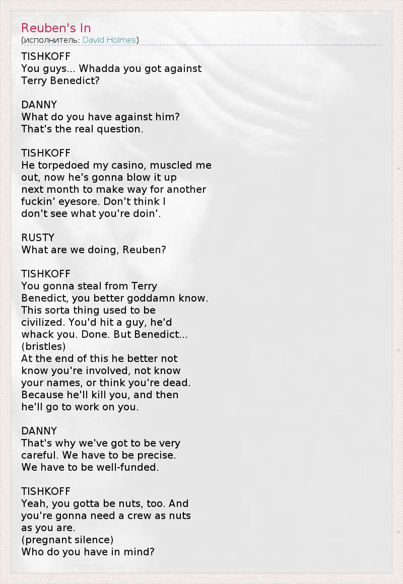 TISHKOFF You guys... Whadda you got against Terry Benedict? DANNY What do you have against him? That's the real question. TISHKOFF He torpedoed my casino, muscled me out, now he's gonna blow it up next month to make way for another fuckin' eyesore. Don't think I don't see what you're doin'. RUSTY What are we doing, Reuben? TISHKOFF You gonna steal from Terry Benedict, you better goddamn know. This sorta thing used to be civilized. You'd hit a guy, he'd whack you. Done. But Benedict... (bristles) At the end of this he better not know you're involved, not know your names, or think you're dead. Because he'll kill you, and then he'll go to work on you. DANNY That's why we've got to be very careful. We have to be precise. We have to be well-funded. TISHKOFF Yeah, you gotta be nuts, too. And you're gonna need a crew as nuts as you are. (pregnant silence) Who do you have in mind?
