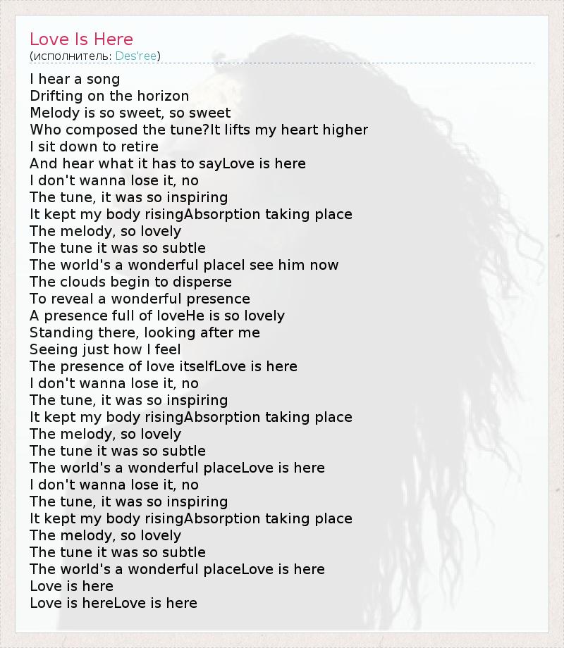 I hear a song Drifting on the horizon Melody is so sweet, so sweet Who composed the tune?It lifts my heart higher I sit down to retire And hear what it has to sayLove is here I don't wanna lose it, no The tune, it was so inspiring It kept my body risingAbsorption taking place The melody, so lovely The tune it was so subtle The world's a wonderful placeI see him now The clouds begin to disperse To reveal a wonderful presence A presence full of loveHe is so lovely Standing there, looking after me Seeing just how I feel The presence of love itselfLove is here I don't wanna lose it, no The tune, it was so inspiring It kept my body risingAbsorption taking place The melody, so lovely The tune it was so subtle The world's a wonderful placeLove is here I don't wanna lose it, no The tune, it was so inspiring It kept my body risingAbsorption taking place The melody, so lovely The tune it was so subtle The world's a wonderful placeLove is here Love is here Love is hereLove is here