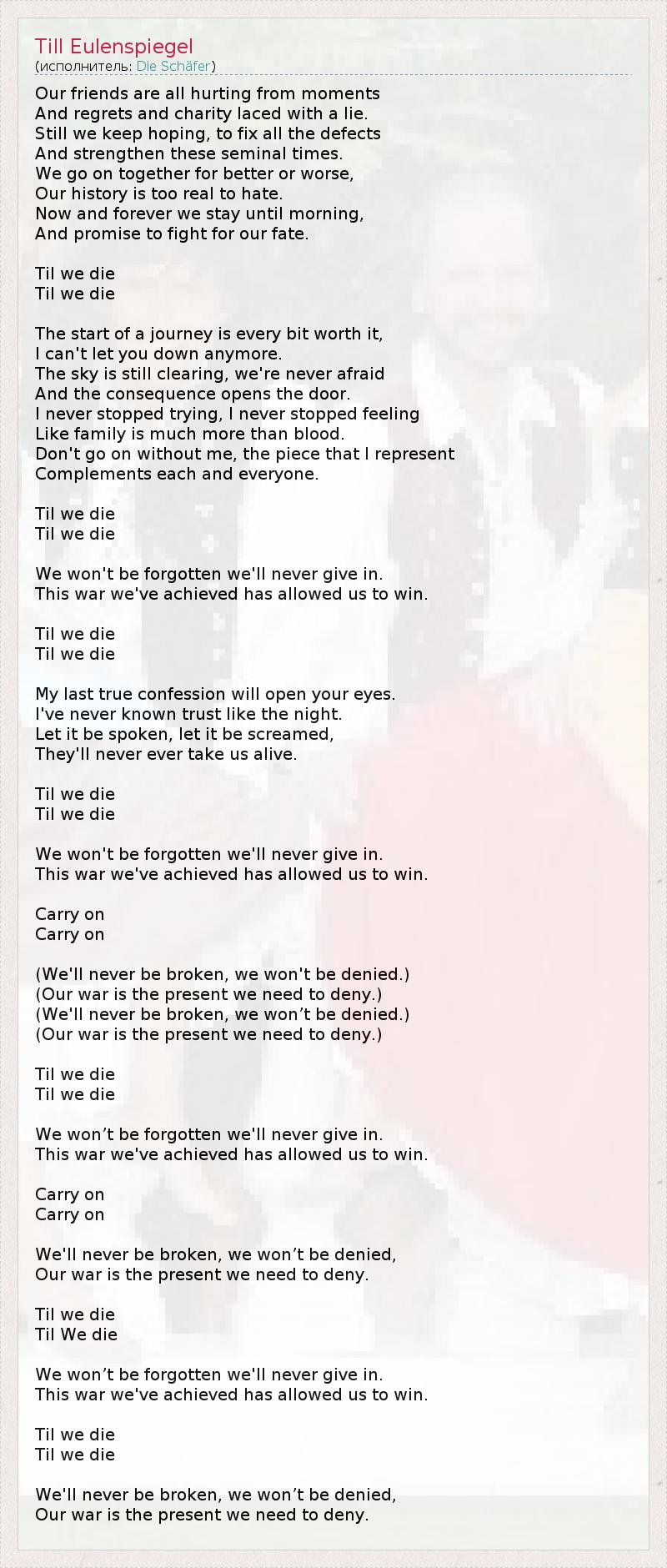 Our friends are all hurting from moments And regrets and charity laced with a lie. Still we keep hoping, to fix all the defects And strengthen these seminal times. We go on together for better or worse, Our history is too real to hate. Now and forever we stay until morning, And promise to fight for our fate. Til we die Til we die The start of a journey is every bit worth it, I can't let you down anymore. The sky is still clearing, we're never afraid And the consequence opens the door. I never stopped trying, I never stopped feeling Like family is much more than blood. Don't go on without me, the piece that I represent Complеments each and everyone. Til we die Til we die We won't be forgotten we'll never give in. This war we've achieved has allowed us to win. Til we die Til we die My last true confession will open your eyes. I've never known trust like the night. Let it be spoken, let it be screamed, They'll never ever take us alive. Til we die Til we die We won't be forgotten we'll never give in. This war we've achieved has allowed us to win. Carry on Carry on (We'll never be broken, we won't be denied.) (Our war is the present we need to deny.) (We'll never be broken, we won’t be denied.) (Our war is the present we need to deny.) Til we die Til we die We won’t be forgotten we'll never give in. This war we've achieved has allowed us to win. Carry on Carry on We'll never be broken, we won’t be denied, Our war is the present we need to deny. Til we die Til We die We won’t be forgotten we'll never give in. This war we've achieved has allowed us to win. Til we die Til we die We'll never be broken, we won’t be denied, Our war is the present we need to deny.