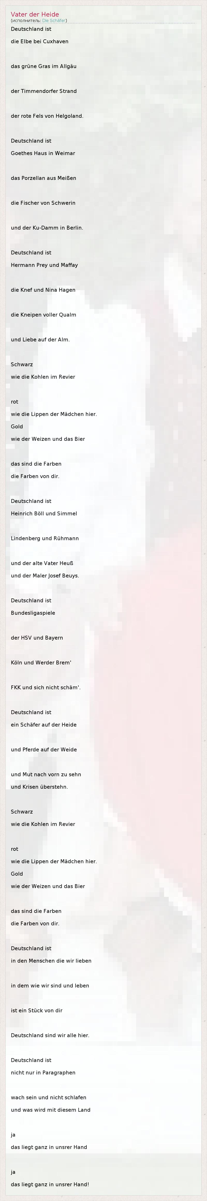 Deutschland ist die Elbe bei Cuxhaven das grüne Gras im Allgäu der Timmendorfer Strand der rote Fels von Helgoland. Deutschland ist Goethes Haus in Weimar das Porzellan aus Meißen die Fischer von Schwerin und der Ku-Damm in Berlin. Deutschland ist Hermann Prey und Maffay die Knef und Nina Hagen die Kneipen voller Qualm und Liebe auf der Alm. Schwarz wie die Kohlen im Revier rot wie die Lippen der Mädchen hier. Gold wie der Weizen und das Bier das sind die Farben die Farben von dir. Deutschland ist Heinrich Böll und Simmel Lindenberg und Rühmann und der alte Vater Heuß und der Maler Josef Beuys. Deutschland ist Bundesligaspiele der HSV und Bayern Köln und Werder Brem' FKK und sich nicht schäm'. Deutschland ist ein Schäfer auf der Heide und Pferde auf der Weide und Mut nach vorn zu sehn und Krisen überstehn. Schwarz wie die Kohlen im Revier rot wie die Lippen der Mädchen hier. Gold wie der Weizen und das Bier das sind die Farben die Farben von dir. Deutschland ist in den Menschen die wir lieben in dem wie wir sind und leben ist ein Stück von dir Deutschland sind wir alle hier. Deutschland ist nicht nur in Paragraphen wach sein und nicht schlafen und was wird mit diesem Land ja das liegt ganz in unsrer Hand ja das liegt ganz in unsrer Hand!