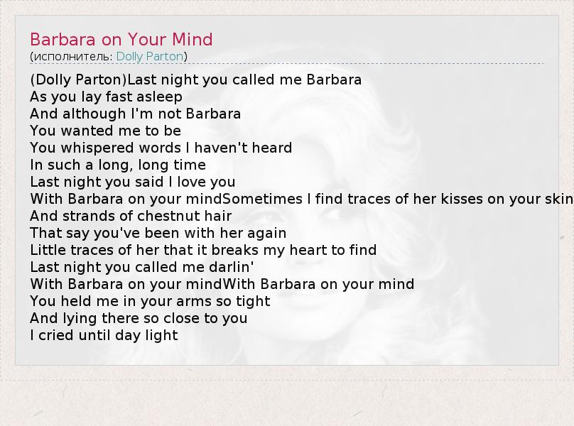 (Dolly Parton)Last night you called me Barbara As you lay fast asleep And although I'm not Barbara You wanted me to be You whispered words I haven't heard In such a long, long time Last night you said I love you With Barbara on your mindSometimes I find traces of her kisses on your skin And strands of chestnut hair That say you've been with her again Little traces of her that it breaks my heart to find Last night you called me darlin' With Barbara on your mindWith Barbara on your mind You held me in your arms so tight And lying there so close to you I cried until day light