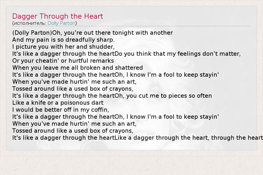 It's like a dagger through the heartLike a dagger through the heart, through the heart