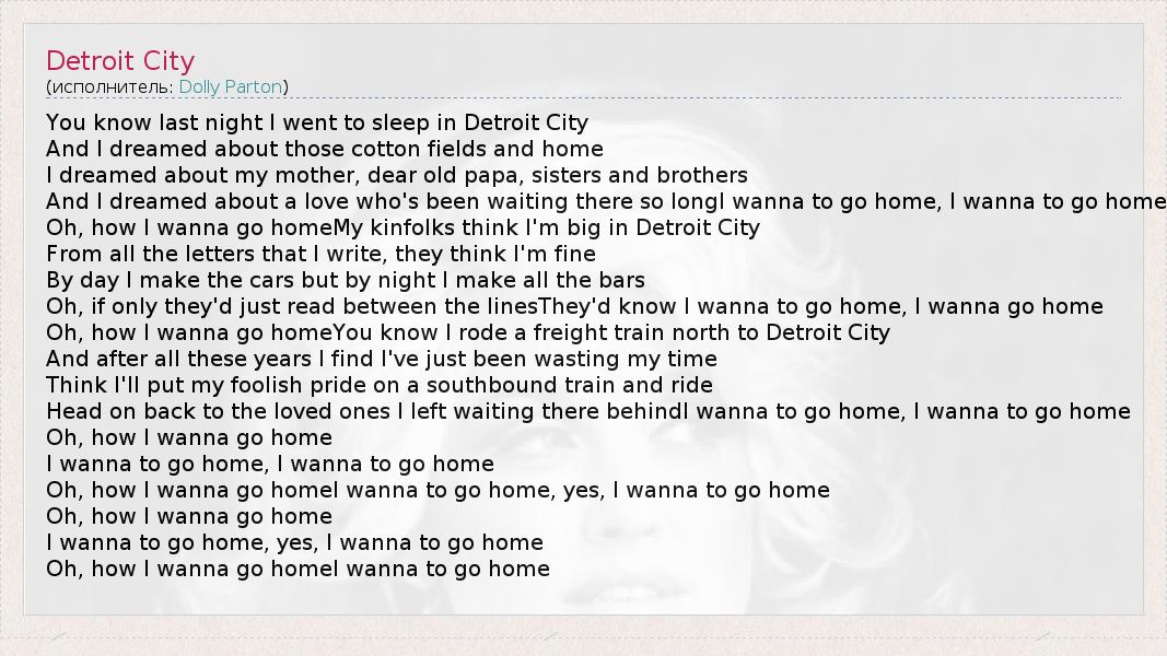 Oh, how I wanna go homeYou know I rode a freight train north to Detroit City