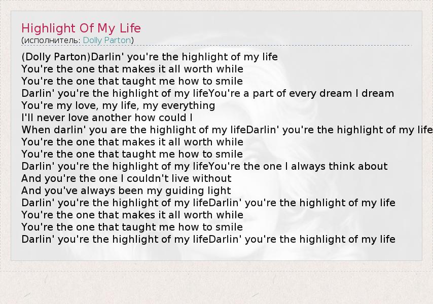 (Dolly Parton)Darlin' you're the highlight of my life