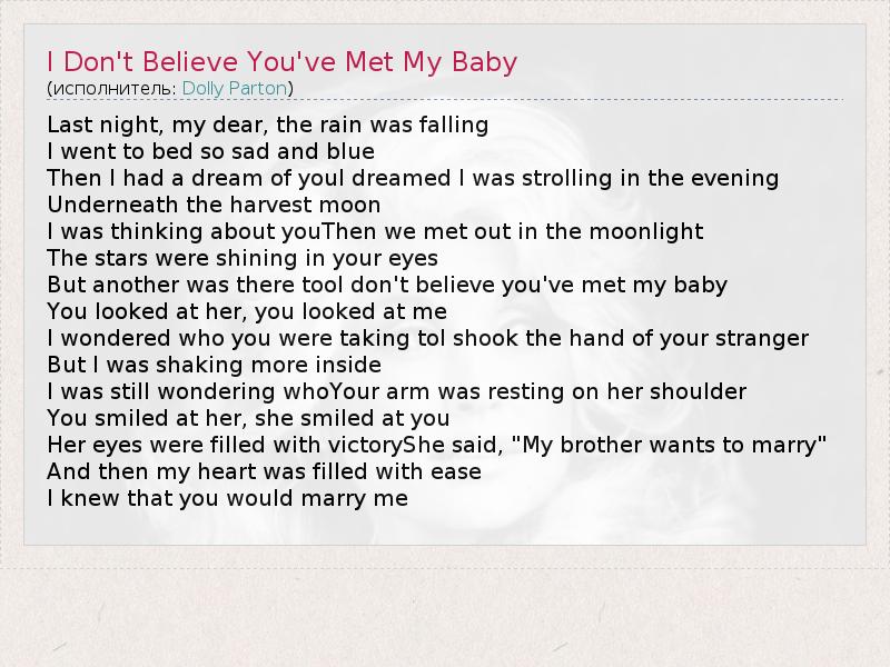 А как ты думаешь, о чем песня "I Don't Believe You've Met My Baby" ?