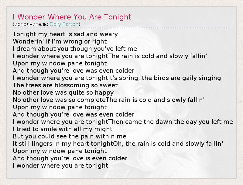 ГлавнаяИсполнителиDolly PartonI Wonder Where You Are Tonight