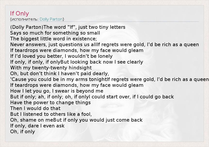 (Dolly Parton)The word "If", just two tiny letters Says so much for something so small The biggest little word in existence; Never answers, just questions us allIf regrets were gold, I'd be rich as a queen If teardrops were diamonds, how my face would gleam If I'd loved you better, I wouldn't be lonely If only, if only, if onlyBut looking back now I see clearly With my twenty-twenty hindsight Oh, but don't think I haven't paid dearly, 'Cause you could be in my arms tonightIf regrets were gold, I'd be rich as a queen If teardrops were diamonds, how my face would gleam How I let you go, I swear is beyond me But if only; ah, if only; oh, if onlyI could start over, if I could go back Have the power to change things Then I would do that But I listened to others like a fool, Oh, shame on meBut if only you would just come back If only, dare I even ask Oh, if only