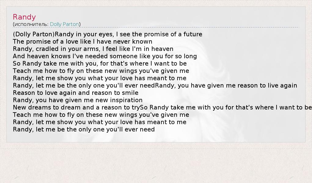 (Dolly Parton)Randy in your eyes, I see the promise of a future