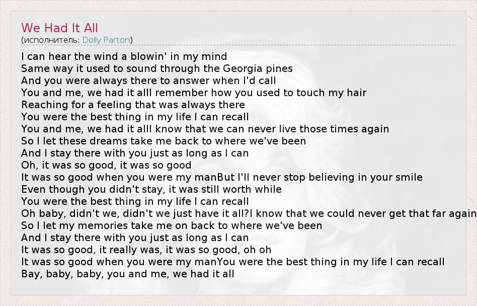 А как ты думаешь, о чем песня "We Had It All" ?