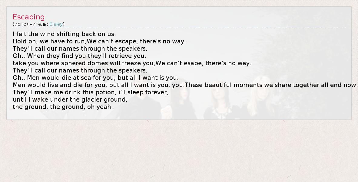 Это интересно:Eisley (Айсли) – инди-поп-рок-группа из города Тайлер, штат ТехасГруппа состоит из 5-ти участников:Шерри ДюПре - гитара, вокал; Стэйси ДюПре - клавишные, вокал; Уэстон ДюПре – ударные; Шантель ДюПре – гитара; Гэррон ДюПре – бас.Вначале, группа называлась Mos Eisley (как в Звёздных войнах), но потом, название сократили до Eisley, перед туром с Coldplay.Eisley выступали с такими группами, как Taking Back... продолжение