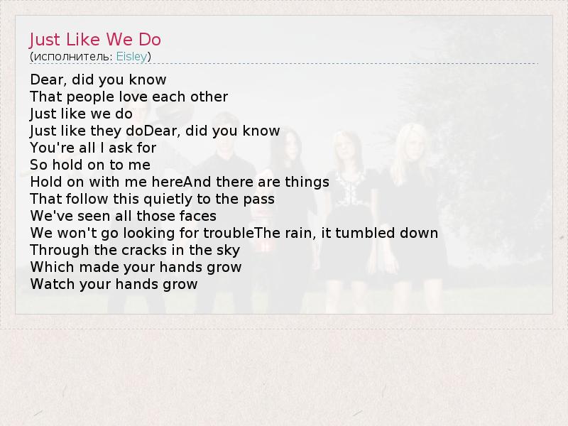 А как ты думаешь, о чем песня "Just Like We Do" ?