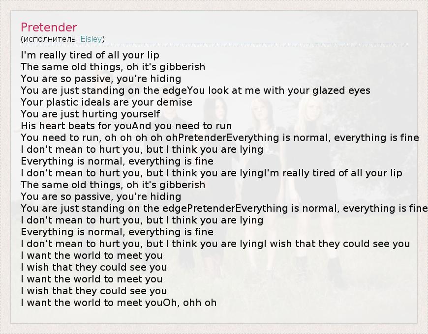 I'm really tired of all your lip The same old things, oh it's gibberish You are so passive, you're hiding You are just standing on the edgeYou look at me with your glazed eyes Your plastic ideals are your demise You are just hurting yourself His heart beats for youAnd you need to run You need to run, oh oh oh oh ohPretenderEverything is normal, everything is fine I don't mean to hurt you, but I think you are lying Everything is normal, everything is fine I don't mean to hurt you, but I think you are lyingI'm really tired of all your lip The same old things, oh it's gibberish You are so passive, you're hiding You are just standing on the edgePretenderEverything is normal, everything is fine I don't mean to hurt you, but I think you are lying Everything is normal, everything is fine I don't mean to hurt you, but I think you are lyingI wish that they could see you I want the world to meet you I wish that they could see you I want the world to meet you I wish that they could see you I want the world to meet youOh, ohh oh