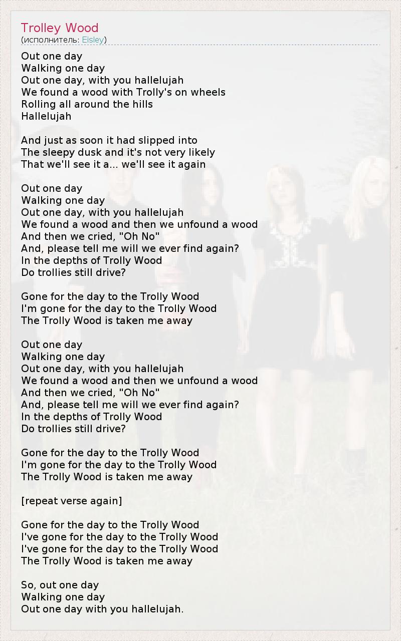 Out one day Walking one day Out one day, with you hallelujah We found a wood with Trolly's on wheels Rolling all around the hills Hallelujah And just as soon it had slipped into The sleepy dusk and it's not very likely That we'll see it a... we'll see it again Out one day Walking one day Out one day, with you hallelujah We found a wood and then we unfound a wood And then we cried, "Oh No" And, please tell me will we ever find again? In the depths of Trolly Wood Do trollies still drive? Gone for the day to the Trolly Wood I'm gone for the day to the Trolly Wood The Trolly Wood is taken me away Out one day Walking one day Out one day, with you hallelujah We found a wood and then we unfound a wood And then we cried, "Oh No" And, please tell me will we ever find again? In the depths of Trolly Wood Do trollies still drive? Gone for the day to the Trolly Wood I'm gone for the day to the Trolly Wood The Trolly Wood is taken me away [repeat verse again] Gone for the day to the Trolly Wood I've gone for the day to the Trolly Wood I've gone for the day to the Trolly Wood The Trolly Wood is taken me away So, out one day Walking one day Out one day with you hallelujah.