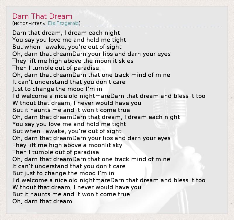 Darn that dream, I dream each night You say you love me and hold me tight But when I awake, you're out of sight Oh, darn that dreamDarn your lips and darn your eyes They lift me high above the moonlit skies Then I tumble out of paradise Oh, darn that dreamDarn that one track mind of mine It can't understand that you don't care Just to change the mood I'm in I'd welcome a nice old nightmareDarn that dream and bless it too Without that dream, I never would have you But it haunts me and it won't come true Oh, darn that dreamDarn that dream, I dream each night You say you love me and hold me tight But when I awake, you're out of sight Oh, darn that dreamDarn your lips and darn your eyes They lift me high above a moonlit sky Then I tumble out of paradise Oh, darn that dreamDarn that one track mind of mine It can't understand that you don't care But just to change the mood I'm in I'd welcome a nice old nightmareDarn that dream and bless it too Without that dream, I never would have you But it haunts me and it won't come true Oh, darn that dream