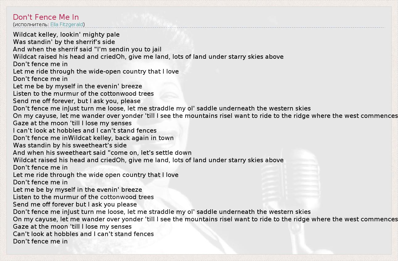 Wildcat kelley, lookin' mighty pale Was standin' by the sherrif's side And when the sherrif said "I'm sendin you to jail Wildcat raised his head and criedOh, give me land, lots of land under starry skies above Don't fence me in Let me ride through the wide-open country that I love Don't fence me in Let me be by myself in the evenin' breeze Listen to the murmur of the cottonwood trees Send me off forever, but I ask you, please Don't fence me inJust turn me loose, let me straddle my ol' saddle underneath the western skies On my cayuse, let me wander over yonder 'till I see the mountains riseI want to ride to the ridge where the west commences Gaze at the moon 'till I lose my senses I can't look at hobbles and I can't stand fences Don't fence me inWildcat kelley, back again in town Was standin by his sweetheart's side And when his sweetheart said "come on, let's settle down Wildcat raised his head and criedOh, give me land, lots of land under starry skies above Don't fence me in Let me ride through the wide open country that I love Don't fence me in Let me be by myself in the evenin' breeze Listen to the murmur of the cottonwood trees Send me off forever but I ask you please Don't fence me inJust turn me loose, let me straddle my ol' saddle underneath the western skies On my cayuse, let me wander over yonder 'till I see the mountains riseI want to ride to the ridge where the west commences Gaze at the moon 'till I lose my senses Can't look at hobbles and I can't stand fences Don't fence me in