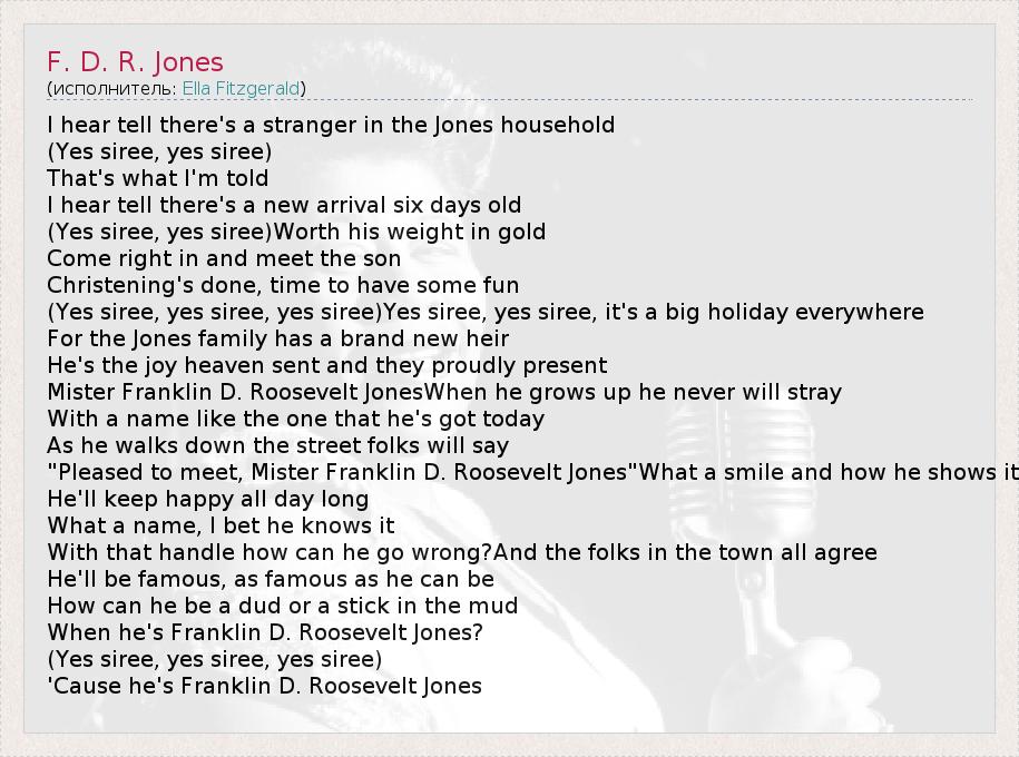 I hear tell there's a stranger in the Jones household (Yes siree, yes siree) That's what I'm told I hear tell there's a new arrival six days old (Yes siree, yes siree)Worth his weight in gold Come right in and meet the son Christening's done, time to have some fun (Yes siree, yes siree, yes siree)Yes siree, yes siree, it's a big holiday everywhere For the Jones family has a brand new heir He's the joy heaven sent and they proudly present Mister Franklin D. Roosevelt JonesWhen he grows up he never will stray With a name like the one that he's got today As he walks down the street folks will say "Pleased to meet, Mister Franklin D. Roosevelt Jones"What a smile and how he shows it He'll keep happy all day long What a name, I bet he knows it With that handle how can he go wrong?And the folks in the town all agree He'll be famous, as famous as he can be How can he be a dud or a stick in the mud When he's Franklin D. Roosevelt Jones? (Yes siree, yes siree, yes siree) 'Cause he's Franklin D. Roosevelt Jones