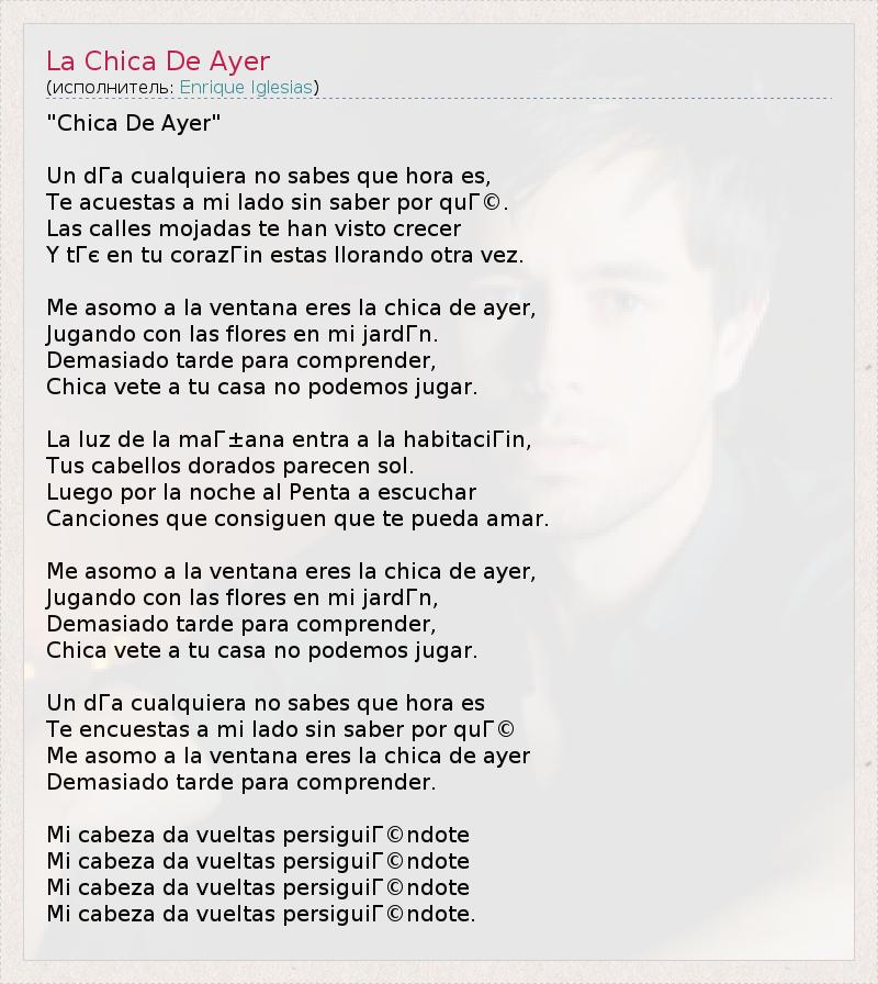 Источник: http://www.amalgama-lab.com/songs/e/enrique_iglesias/la_chica_de_ayer.html#ixzz1TYzvQXzx