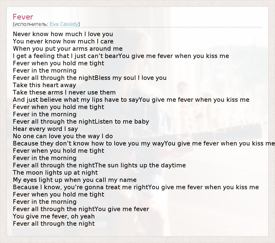 Never know how much I love you You never know how much I care When you put your arms around me I get a feeling that I just can't bearYou give me fever when you kiss me Fever when you hold me tight Fever in the morning Fever all through the nightBless my soul I love you Take this heart away Take these arms I never use them And just believe what my lips have to sayYou give me fever when you kiss me Fever when you hold me tight Fever in the morning Fever all through the nightListen to me baby Hear every word I say No one can love you the way I do Because they don't know how to love you my wayYou give me fever when you kiss me Fever when you hold me tight Fever in the morning Fever all through the nightThe sun lights up the daytime The moon lights up at night My eyes light up when you call my name Because I know, you're gonna treat me rightYou give me fever when you kiss me Fever when you hold me tight Fever in the morning Fever all through the nightYou give me fever You give me fever, oh yeah Fever all through the night