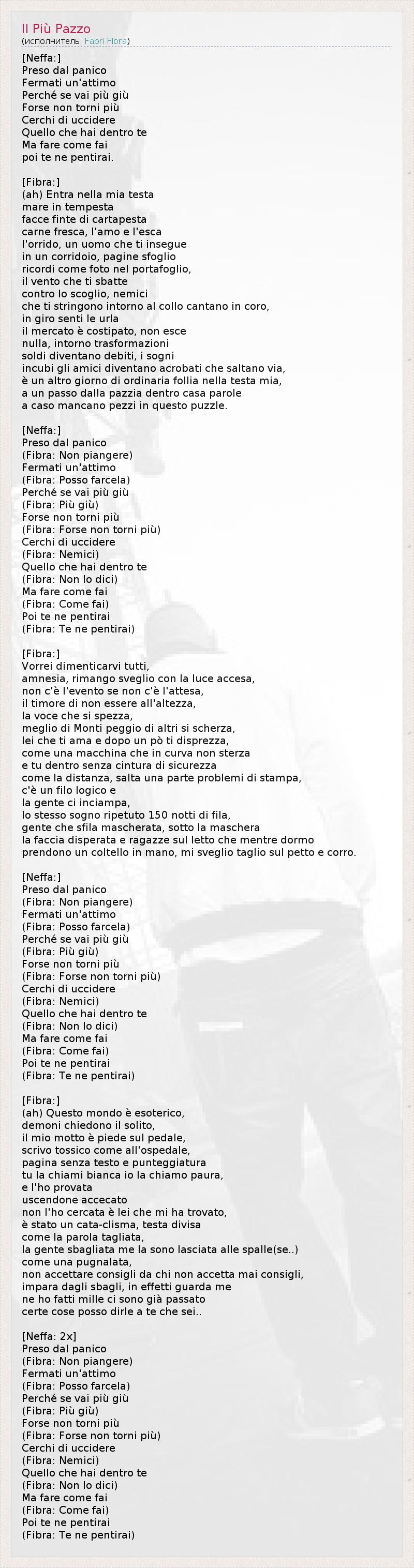 [Неффа:] В панике Остановись, одумайся. Ведь если ты падаешь, Возможно, вернуться уже не получится никогда. Если попытаешься убить То, что у тебя внутри, Об этом поступке Ты потом пожалеешь. [Фибра:] В моей голове Начинается буря, Лица - маски из папье-маше, Свежая плоть, любовь и приманка В ущелье, человек, который тебя преследует В коридоре, на страницах Воспоминаний, как фотографии в портфолио, Ветер, который бросает тебя На скалы, отовсюду слышны голоса врагов, Которые сжимают тебе горло, поют хором, Горланят во всю глотку - Трансферный рынок [в футболе] переполнен, ему не уйти. Ничего! Ничего не изменилось! Деньги превращаются в долги, в снах Друзья становятся акробатами и срываются с трапеции. Просыпаешься на следующий день - и в голове царит привычное безумие, Всего в шаге от полного сумасшествия в моем доме - про дом я добавил На случай, если в этом паззле есть недостающие части. [Неффа:] В панике (Фибра: не плачь) Остановись, одумайся. (Фибра: я могу с этим справиться) Ведь если ты падаешь, (Фибра: еще ниже) Возможно, вернуться уже не получится никогда. (Фибра: Может быть, никогда не вернусь) Если попытаешься убить (Фибра: враги) То, что у тебя внутри, (Фибра: не говори) Об этом поступке (Фибра: твоём поступке) Ты потом пожалеешь. Фибра: пожалеешь) [Фибра:] Хочу забыть всех вас, Амнезия, не смыкаю глаз, оставив свет включённым. Если ничего не ждать, ничего и не произойдет. Страх оказаться не на высоте, Прерывающийся голос, Лучше, чем Монти, 1 и хуже чем остальные шутит Она, которая любит тебя, но вскоре уже презирает, Как машина, у которой на повороте отказывает руль, А ты, сидящий внутри, не пристегнут; Как пустое место в газете - опечатка, Что вполне логично: Люди натыкаются на такое случайно. И тот же сон повторяется сто пятьдесят ночей подряд: Люди сбрасывают маски, а под маской Гримаса отчаянья. И девчонки в моей постели, пока я сплю, Хватают нож. Я просыпаюсь с раной в груди и убегаю прочь. [Неффа:] В панике (Фибра: не плачь) Остановись, одумайся. (Фибра: я могу с этим справиться) Ведь если ты падаешь, (Фибра: еще ниже) Возможно, вернуться уже не получится никогда. (Фибра: Может быть, никогда не вернусь) Если попытаешься убить (Фибра: враги) То, что у тебя внутри, (Фибра: не говори) Об этом поступке (Фибра: твоём поступке) Ты потом пожалеешь. Фибра: пожалеешь) [Фибра:] Ах, этот сказочный мир, Демоны просят всё того же. Мой девиз - крути педали. Пишу заразно, как в больнице. Страница без текста и знаков препинания, Ты назовешь ее пустой, я назову это страхом, И я это доказал. Выхожу ослепленный, Не искал её - она сама меня нашла. Случилась беда, голова раскалывается, Как укороченное слово. Люди совершили ошибку, оставив меня позади, Словно ножом ткнули... Не принимай советы от тех, кто сам никогда не следует чужим советам, Учись на ошибках, реально, посмотри на меня: Да у меня тысячи ошибок в прошлом, И по некоторым вещам могу сказать тебе, что ты... [Неффа: 2x] В панике (Фибра: не плачь) Остановись, одумайся. (Фибра: я могу с этим справиться) Ведь если ты падаешь, (Фибра: еще ниже) Возможно, вернуться уже не получится никогда. (Фибра: Может быть, никогда не вернусь) Если попытаешься убить (Фибра: враги) То, что у тебя внутри, (Фибра: не говори) Об этом поступке (Фибра: твоём поступке) Ты потом пожалеешь. Фибра: пожалеешь) 1 - Председатель Совета министров Италии с 2011 года
