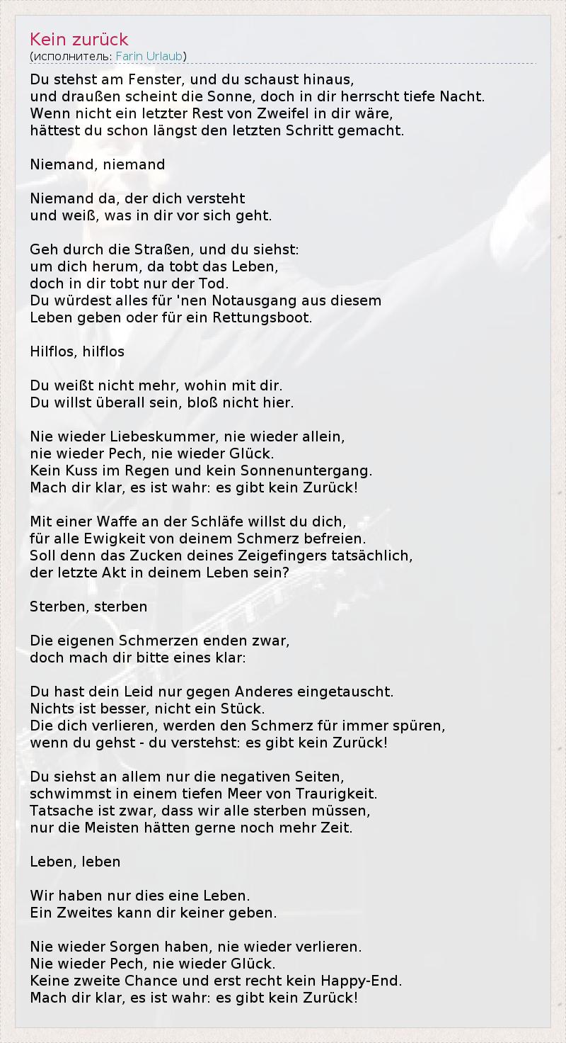 Du stehst утра Fenster , унд -дю- schaust Hinaus , унд draußen scheint умереть Sonne , Дочь в реж herrscht Tiefe Nacht . Венна Nicht Эйн letzter Отдых фон Zweifel в реж изделия, hättest дю Шон längst ден letzten Schritt gemacht . Niemand , Niemand Niemand да , дер Dich versteht унд Вайс , был в реж фор Сич Гехт . Geh Durch умереть Straßen , унд -дю- siehst : гм Dich herum , да tobt дас Leben , Дочь в реж tobt Нур -дер- Тода . Du würdest Alles für " нен Notausgang AUS diesem Leben Гебен Одер für Эйн Rettungsboot . Hilflos , hilflos Du weißt Nicht Mehr , Wohin Mit реж. Du Willst überall Сейн , Блосс Nicht Иер . Nie Wieder Liebeskummer , Nie Wieder Allein , Nie Wieder Печ , Nie Wieder Глюк . Kein Kuss им Regen унд Kein Sonnenuntergang . Mach реж прозрачное , ES циональный wahr : ES Gibt Kein Zurück ! Mit етег Waffeдер Schläfe Willst дю Dich , für Alle Ewigkeit фон deinem Schmerz befreien . Soll Denn дас Zucken deines Zeigefingers tatsächlich , дер Letzte Акт в deinem Leben Сейн ? Sterben , Sterben Die eigenen Schmerzen enden Zwar , Дочь Маха реж Bitte eines прозрачное : Du Ты Дейн Leid Нур геген Anderes eingetauscht . Nichts IST Бессер , Nicht Эйн застрял. Die Dich verlieren , Верден Den Schmerz für IMMER Spuren , Венна дю gehst - дю verstehst : ES Gibt Kein Zurück ! Du siehstAllem Нур умереть negativen Seiten , schwimmst в Einem Tiefen Meer фон Traurigkeit . Tatsache IST Zwar , Dass Wir Все Sterben Mussen , Нур умереть Meisten Hatten Gerne Ночь Mehr Zeit . Leben , Leben Wir Haben Нур умирает сделайте Leben . Ein Zweites Канн реж Keiner Гебен . Nie Wieder Sorgen Haben , Nie Wieder verlieren . Nie Wieder Печ , Nie Wieder Глюк . Keine Zweite Шанс унд некогда Рехт Kein Happy- End . Mach реж прозрачное , ES циональный wahr : ES Gibt Kein Zurück !