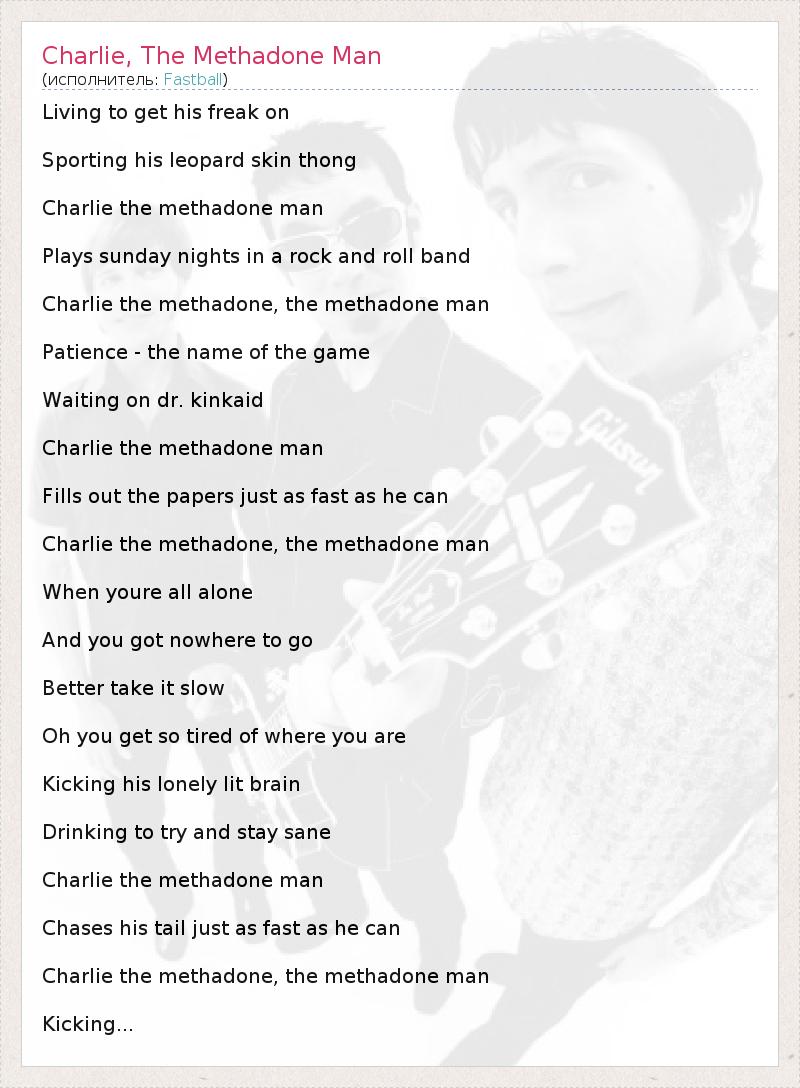 Living to get his freak on Sporting his leopard skin thong Charlie the methadone man Plays sunday nights in a rock and roll band Charlie the methadone, the methadone man Patience - the name of the game Waiting on dr. kinkaid Charlie the methadone man Fills out the papers just as fast as he can Charlie the methadone, the methadone man When youre all alone And you got nowhere to go Better take it slow Oh you get so tired of where you are Kicking his lonely lit brain Drinking to try and stay sane Charlie the methadone man Chases his tail just as fast as he can Charlie the methadone, the methadone man Kicking...